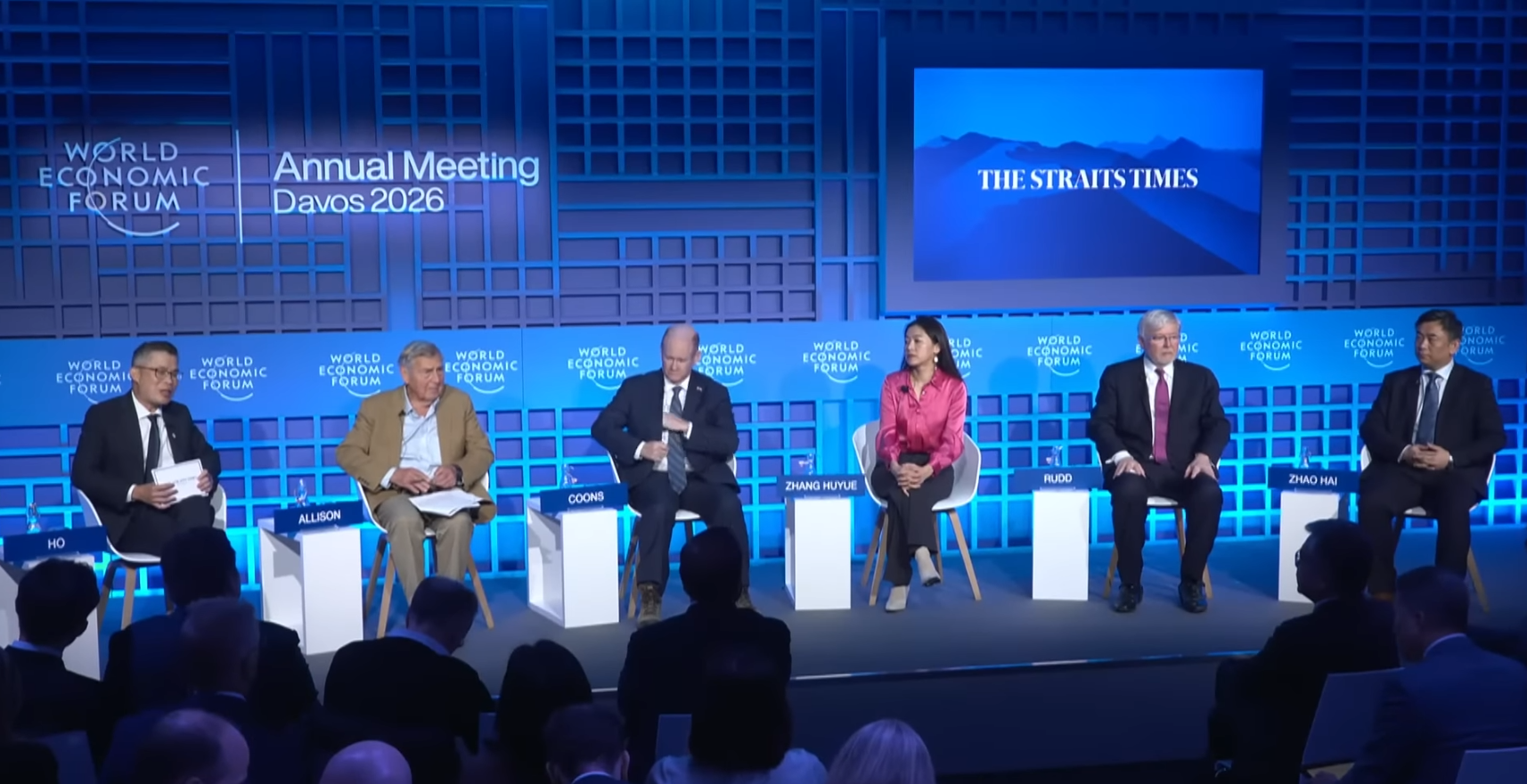 格雷厄姆·艾利森教授(左二)、赵海博士(右一)参加达沃斯论坛的中美关系分论坛,主持人为新加坡《海峡时报》编辑Jaime Ho 视频截图