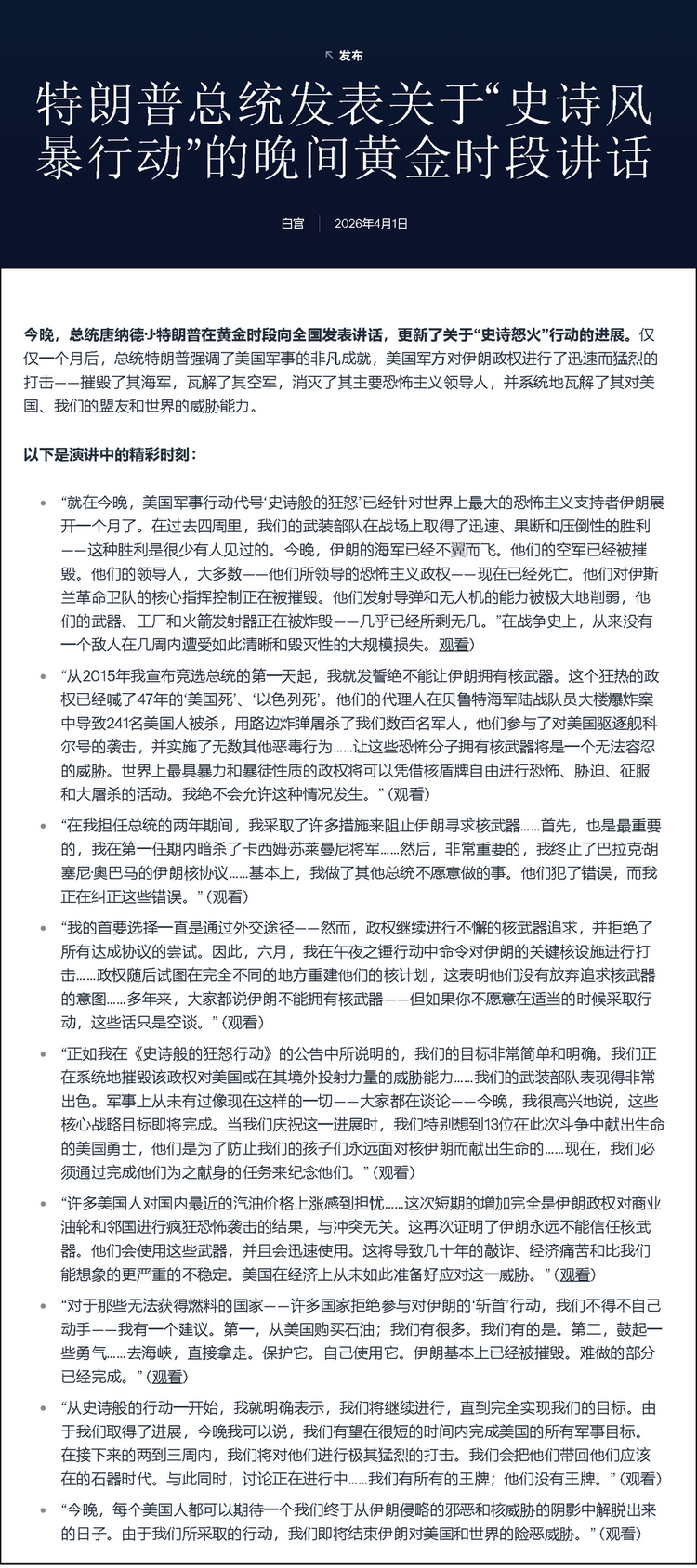 他将这场战争,描述为其多年来阻止伊朗获得核武器的最新举措,声称这场战争“对美国的安全和‘自由时间’的安全是必要的”。