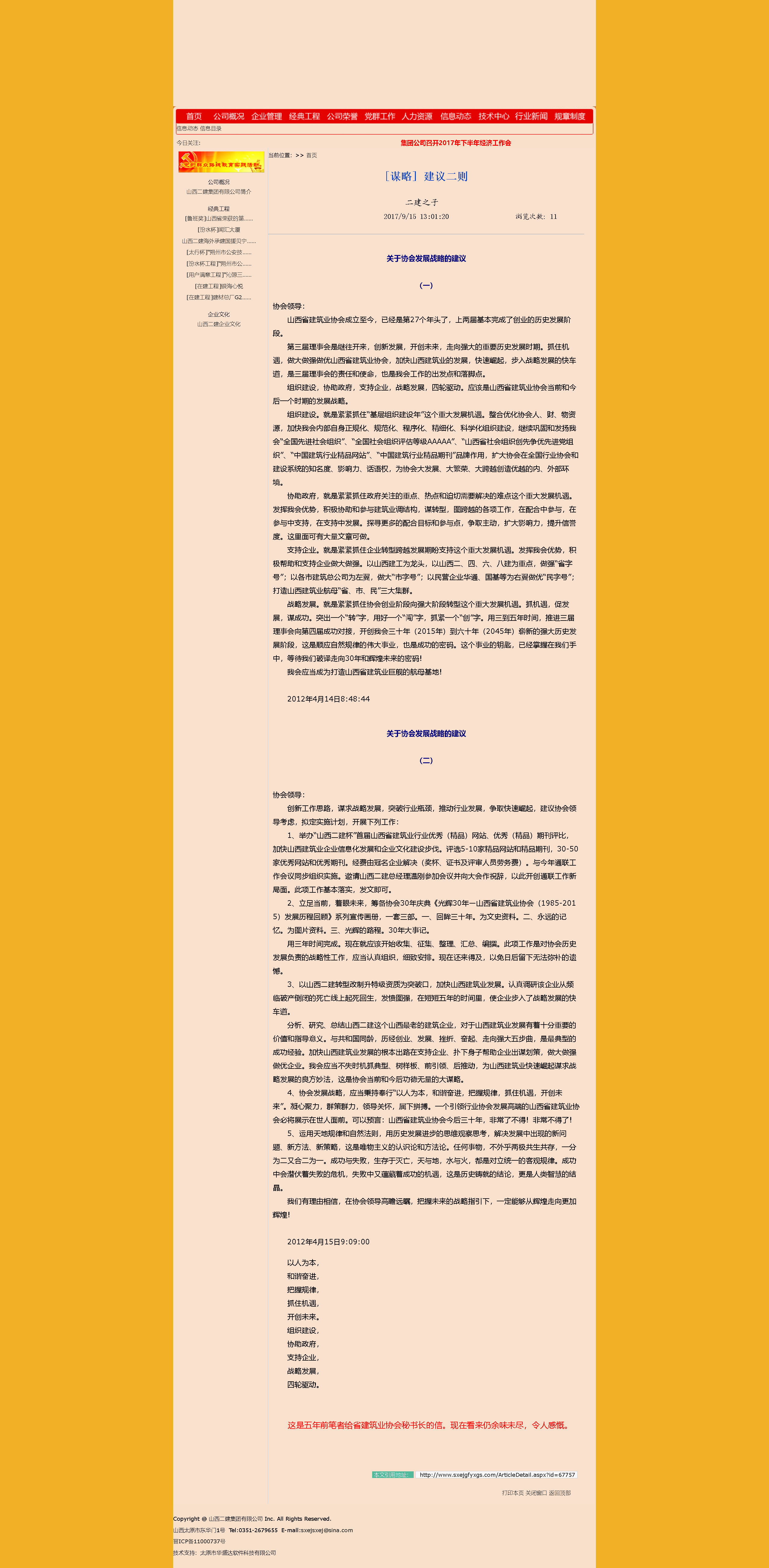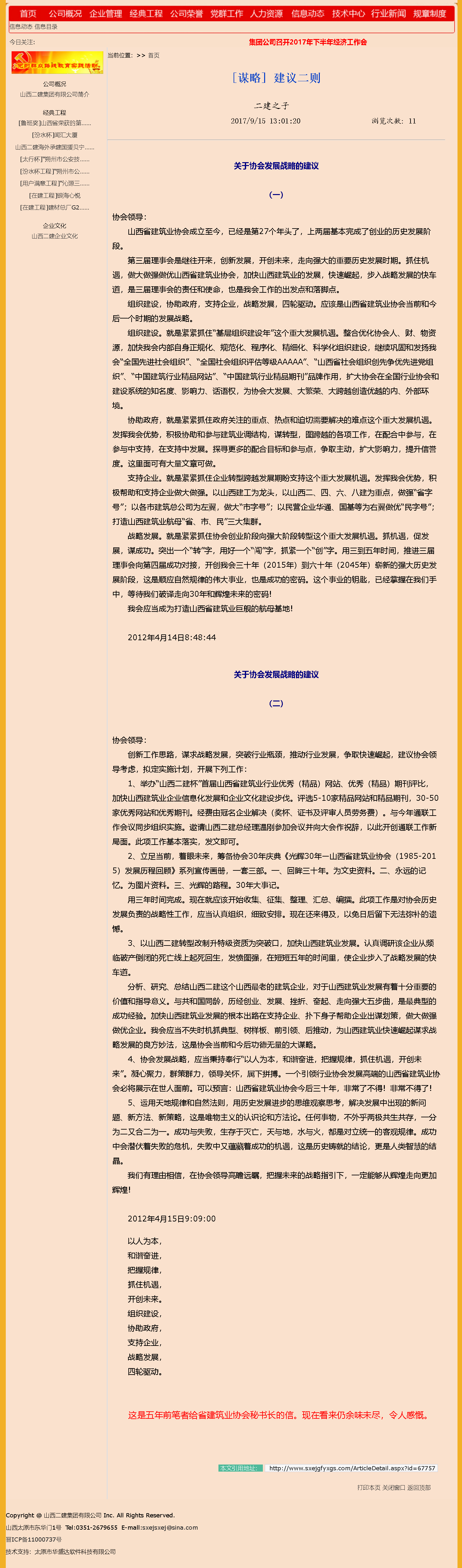 这是十年前在山西二建集团有限公司网上,发表的我在2012年写给山西省建筑业协会秘书长的两封信。