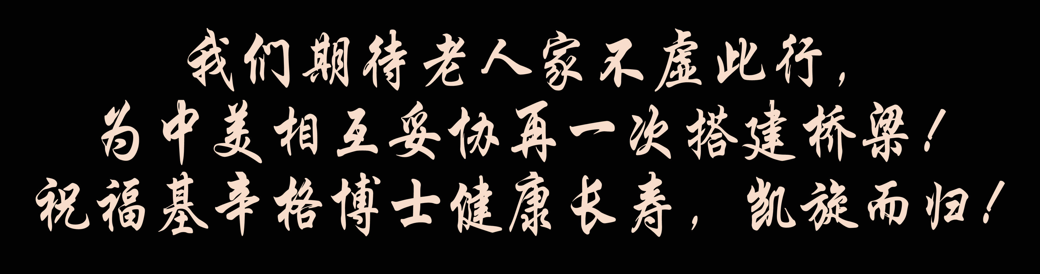 这位老寿星此次来中国,担负着上天赋予他的使命和任务,那就是中美两个决定人类未来的东西方神圣,不能再继续相互指责,互相斗争,相互受伤,彼此不容了!作为和事老,我们期待老人家不虚此行,为中美相互妥协再一次搭建桥梁!