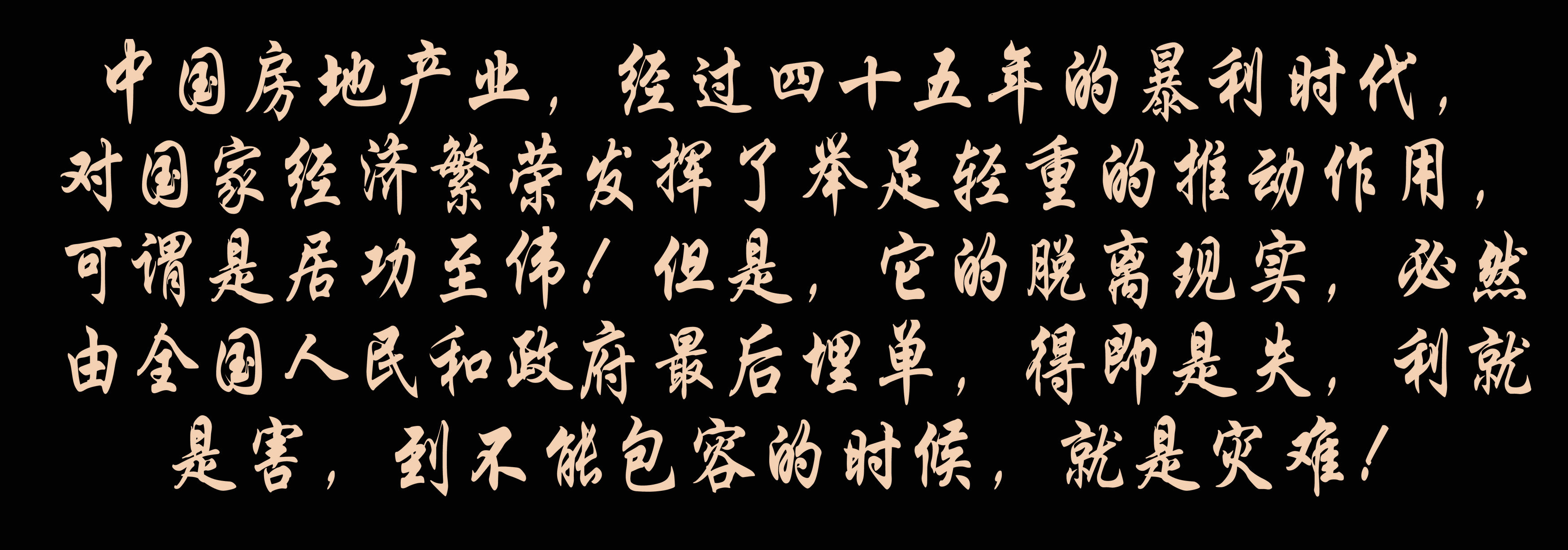 中国房地产业,经过四十五年的暴利时代,对国家经济繁荣发挥了举足轻重的推动作用,可谓是居功至伟!但是,它的脱离现实,必然由全国人民和政府最后埋单,得即是失,利就是害,到不能包容的时候,就是灾难!